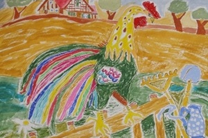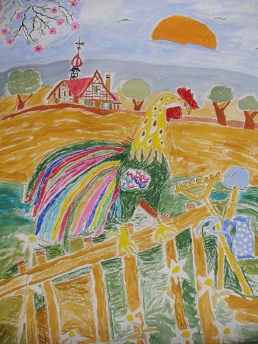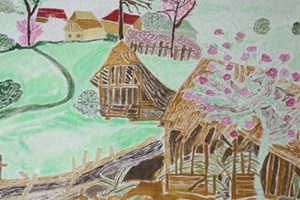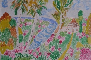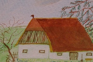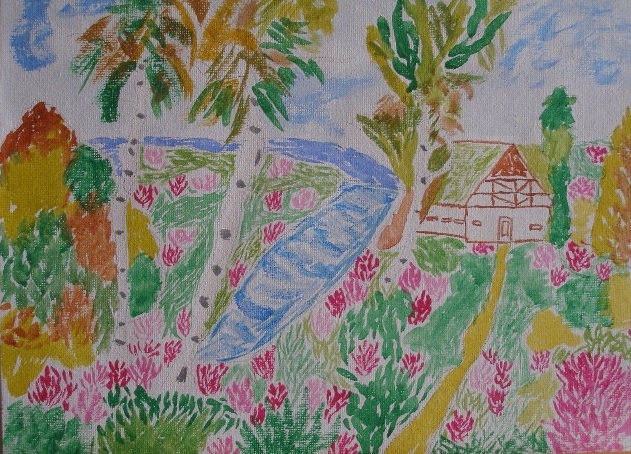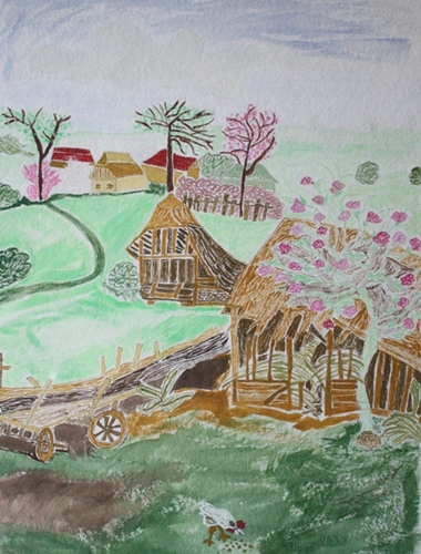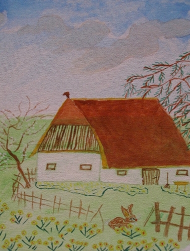 Bauernhaus im Frühling oder Hase in Bauernhof eindringend (Acryl auf Malkarton)